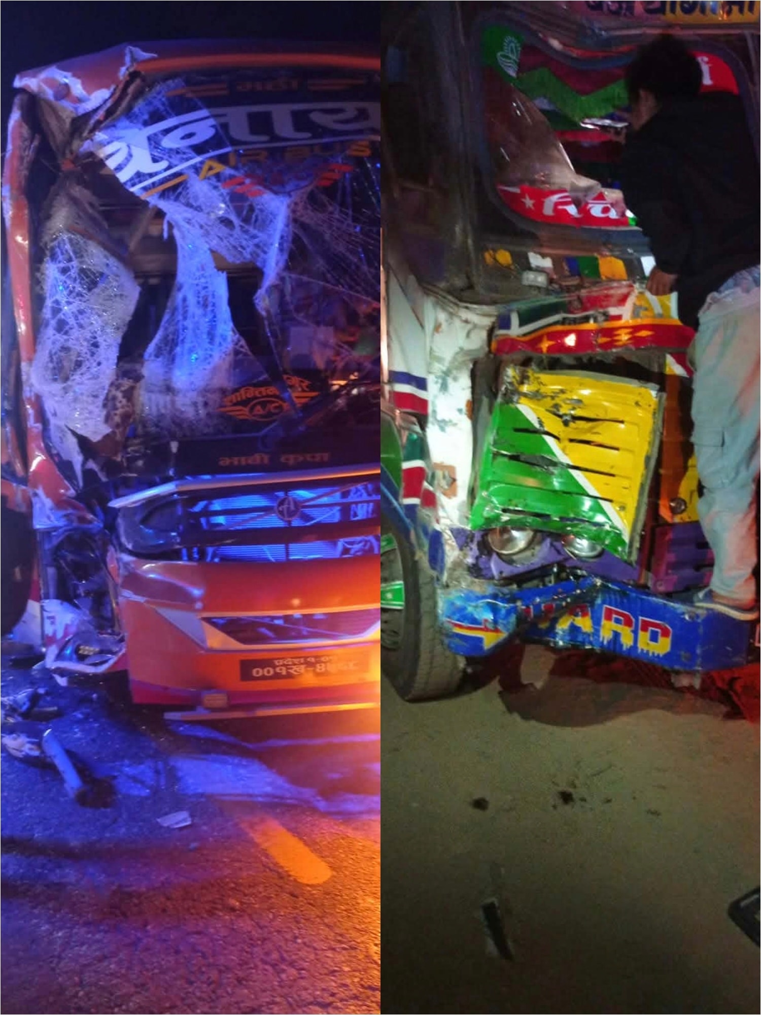 शुक्रबार राति करिब ११ः४० बजे हेटौंडाबाट मनहरीतर्फ जाँदै गरेको बा प्र ०६–००१ ख ०४१५ नम्बरको चामल बोकेको ट्रक र विपरीत दिशाबाट आउँदै गरेको प्र १–०१–००१ ख ४७६८ नम्बरको यात्रुबाहक बस एकआपसमा ठोक्किँदा दुर्घटना भएको प्रहरीले जनाएको छ ।